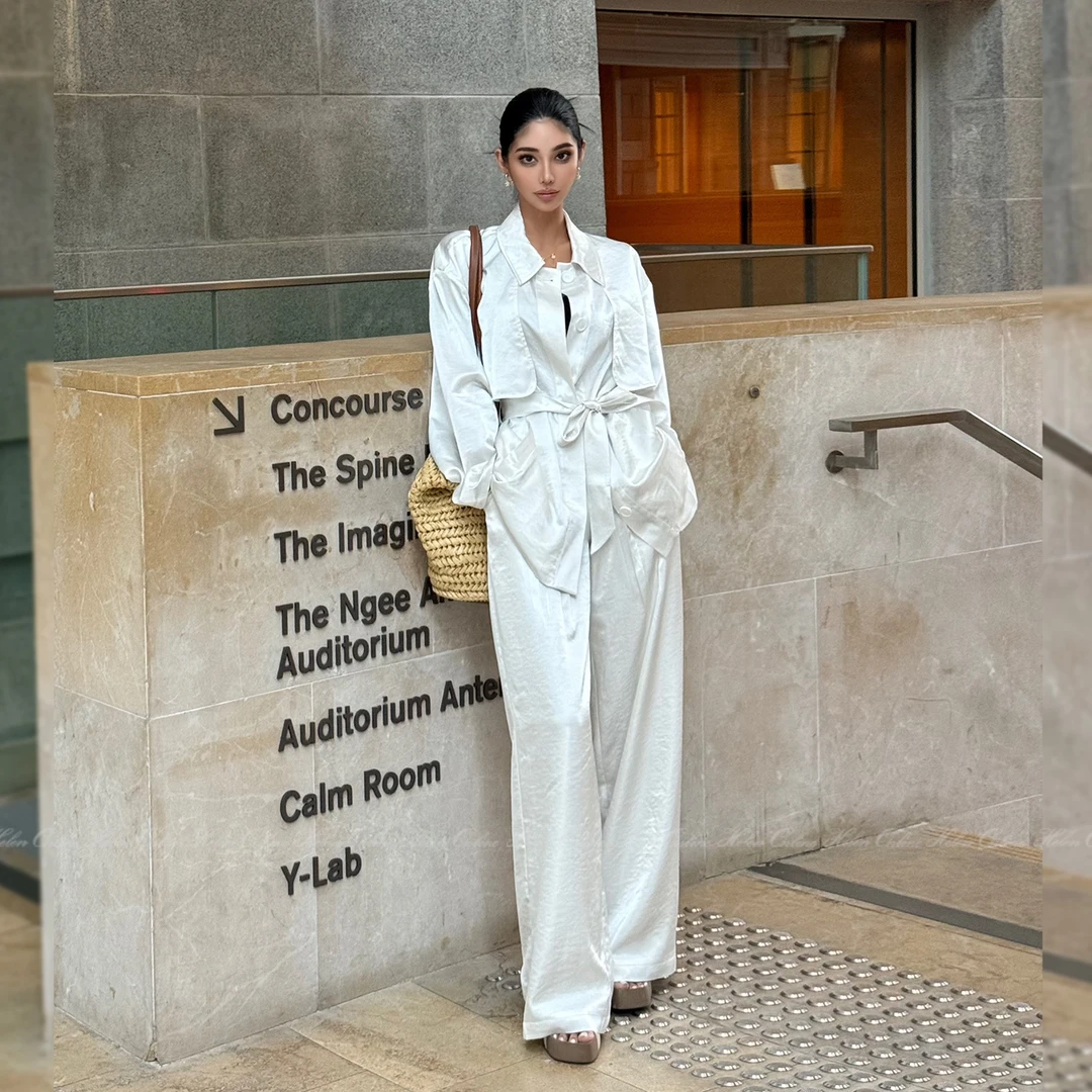 #秋冬都市硬核穿搭 轻奢高级感缎面套装女显瘦翻领外套阔腿裤两件套#高级感穿搭 #爱了爱了 #套装显瘦穿搭 #我要上热门
